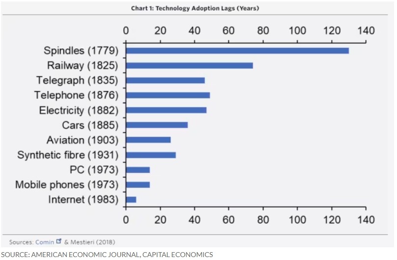 例如,据Capital Economics,蒸汽机车发明后,花了70多年才被广泛采用,而信息和通信技术革命的采用滞后时间被缩短到五到十年。到1990年代中期,技术的影响开始在经济数据中显现,在这个十年的下半期,美国生产率的增长速度大约是1980年代的两倍。
