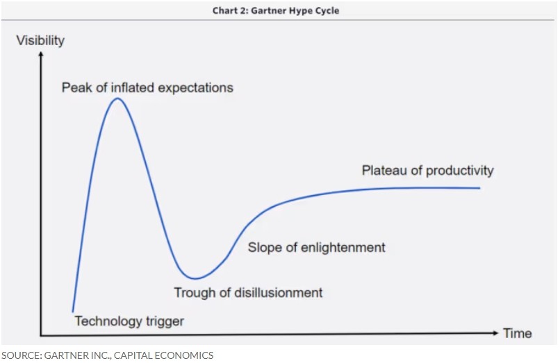 事实上,Shearing表示,目前发生的情况似乎是AI正在遵循“Gartner炒作周期”(Gartner Hype Cycle),该周期展示了公众对新技术影响的看法如何随时间演变(见下图)。