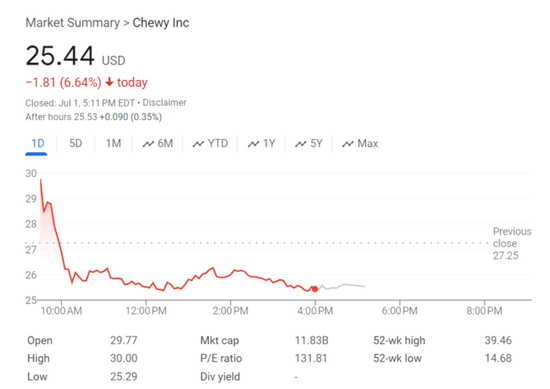 周一同日,在Gill持有在线宠物食品和产品零售商Chewy 6.6%的股份被披露后,Chewy股价一度飙升10%。不过,Chewy收盘时回吐全部涨幅,且下跌6.6%。