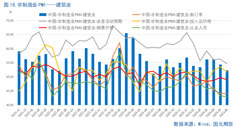 6月非制造业商务活动指数景气度环比回落,尤其是建筑业PMI,是非制造业PMI下滑的主要拖累。建筑业方面,一方面是由于气候原因,南方持续强降雨对户外施工造成一定影响,居民出行及消费也受影响,另一方面政府债发行规模仍然偏小叠加气候影响,实物工作量不及预期,而新政落地后仍未传导至投资端及施工端,故而导致建筑业缺乏支撑。而服务业方面,5月小长假需求集中释放,本月接触型消费相关服务业活动在高基数的基础上有所回落,6月服务业PMI较上月出现小幅回落,但业务活动预期回升,暑期即将到来,可能反映出了当前市场对暑期消费存在较强的预期。