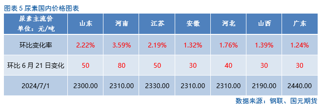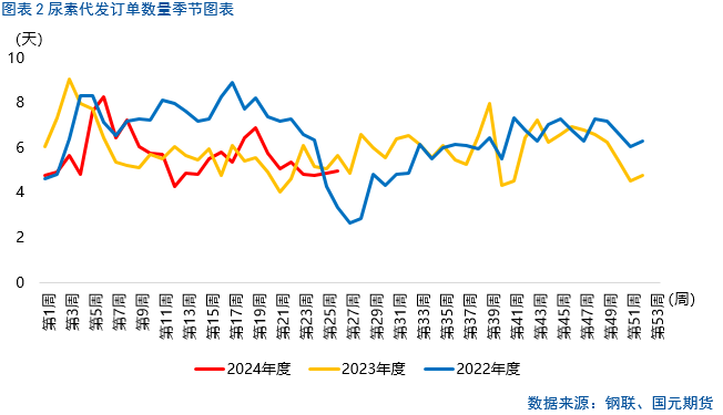 后市对国内尿素刚需看淡,主要原因是前期局部旱情缓解带来的补仓持续性有限。考虑到东北地区的追肥期即将步入尾声,而南方个别地区受降雨以及北方地区在干旱的影响下,需求相对有限,而同时尿素现货价格偏高,下游市场接受度下移。截至2024年6月26日,中国尿素企业预收订单天数5日,较上周增加0.12日,环比增加2.46%。