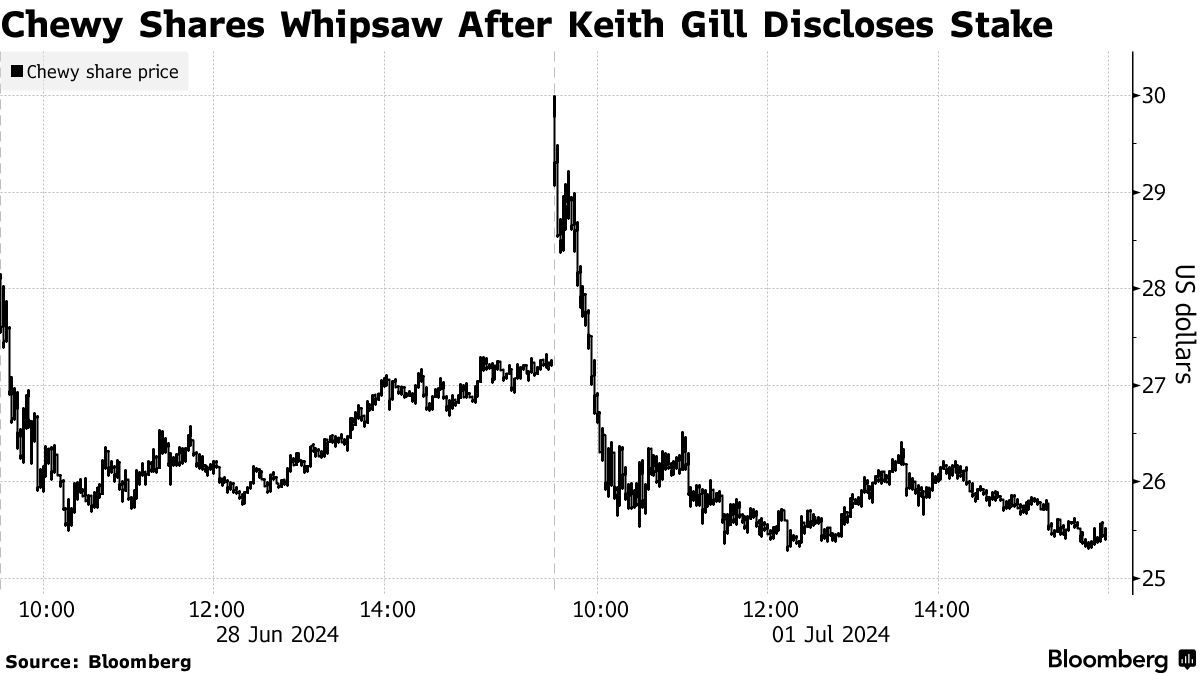 据了解,美国证券交易委员会(SEC)官网披露的持股信息显示,Keith Gil拥有约900万股Chewy的A类股票,按上周五收盘价计算总计价值大约2.45亿美元。上周,Keith Gil在社交媒体X上发布了一只以狗为主体的卡通图片,引发Chewy和Petco Health and Wellness(WOOF.US)股价短暂飙升。数据显示,自5月初以来,Chewy的股价已经上涨了约70%,但仍比2021年的峰值低79%。