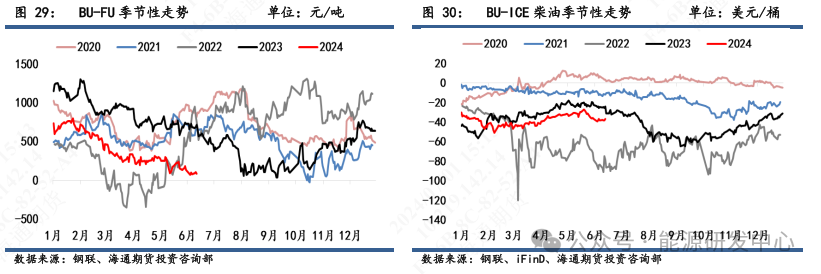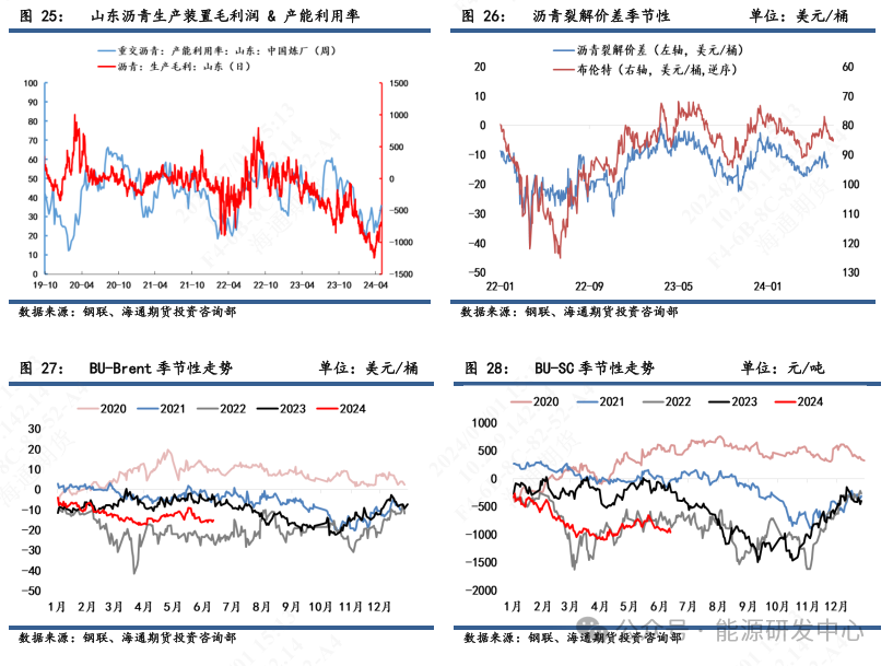本周利润亏损再次增加。6月21日当周,经钢联测算的山东沥青生产毛利为-832.0元/吨,环比上周-766.4元/吨亏损增加。在弱平衡的基本面和相对高位的成本端约束下,炼厂仍旧面临运营不佳。6月28日,BU-Brent裂解差为-15美元/桶,环比6月21日-15美元/桶基本持平。BU-SC裂解差为-956元/吨,环比6月21日-922元/吨回落。BU-FU裂解差为85元/吨,环比6月21日73元/吨略微增加。BU-ICE柴油裂解差为-36.9美元/桶,环比6月21日-36.7美元/桶基本持平。