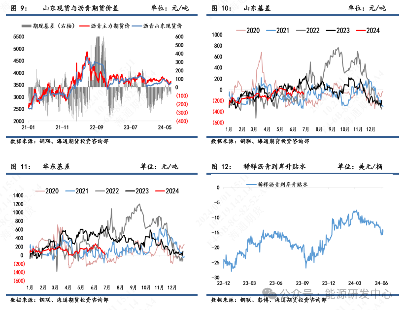 本周山东现货依旧贴水期货。截止6月28日,山东期现基差录得-69元/吨,环比6月21日-61元/吨略微回落,处于中性偏低水平;华东期现基差录得21元/吨,环比6月21日115元/吨回落。6月28日,稀释沥青到岸升贴水为-14.4美元/桶,环比6月21日-15.8美元/桶低位回升。