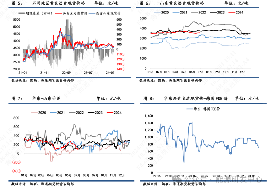 价格,期价继续震荡回升。截止6月28日,沥青主力合约收于3649元/吨,环比6月21日上涨44元/吨,涨幅1.2%。现价继续企稳回升。截止6月28日,山东重交沥青现货价为3580元/吨,环比6月21日3540元/吨涨幅1%。山东现货依旧贴水期货。截止6月28日,山东期现基差录得-69元/吨,环比6月21日-61元/吨略微回落,处于中性偏低水平。